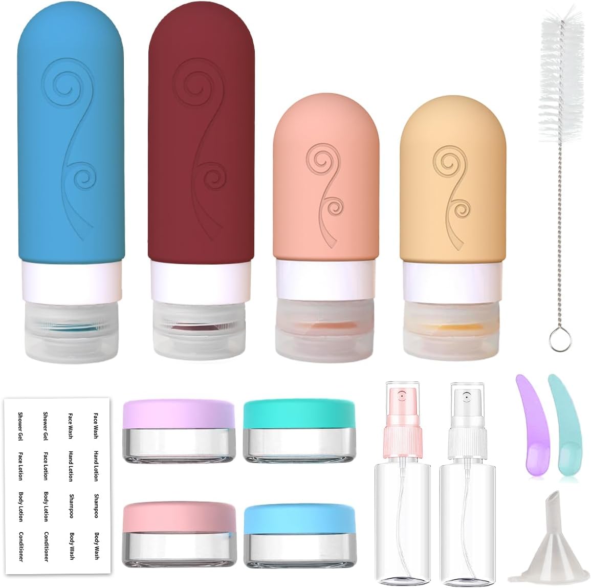 Includes 4 bottles, 4 jars, 2 spray bottles, scoopers, funnel, brush, label and bag for organizing toiletries