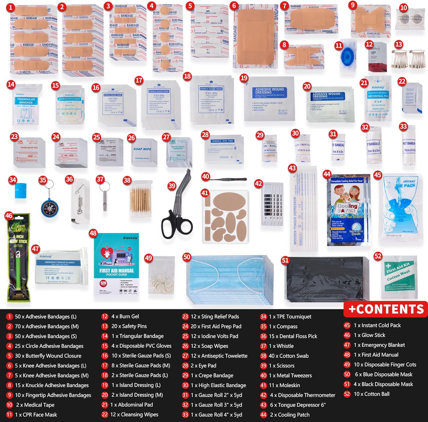 MUST-HAVE FIRST AID KIT – This comprehensive first aid kit includes 520 pieces of essential medical supplies, perfect for handling unexpected emergencies in daily life. Treat minor injuries like cuts, burns, scrapes, and wounds with ease using the high-quality contents inside. The kit features adhesive bandages, gauze pads, a tourniquet, an emergency blanket, a first aid guide, and more, ensuring you’re well-prepared for any unforeseen situations.