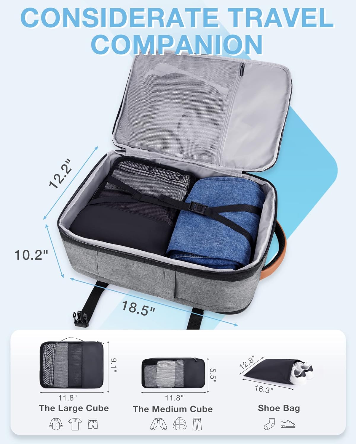 Iterative Update: The expandable design and large capacity can store 3-5 days of clothes as you need. The travel backpack carry on flight approved also has a built-in elastic band, which can compress clothes, preventing them from falling, maximizing the use of the carry on backpack for airplanes storage space, and saving an additional 10% of capacity