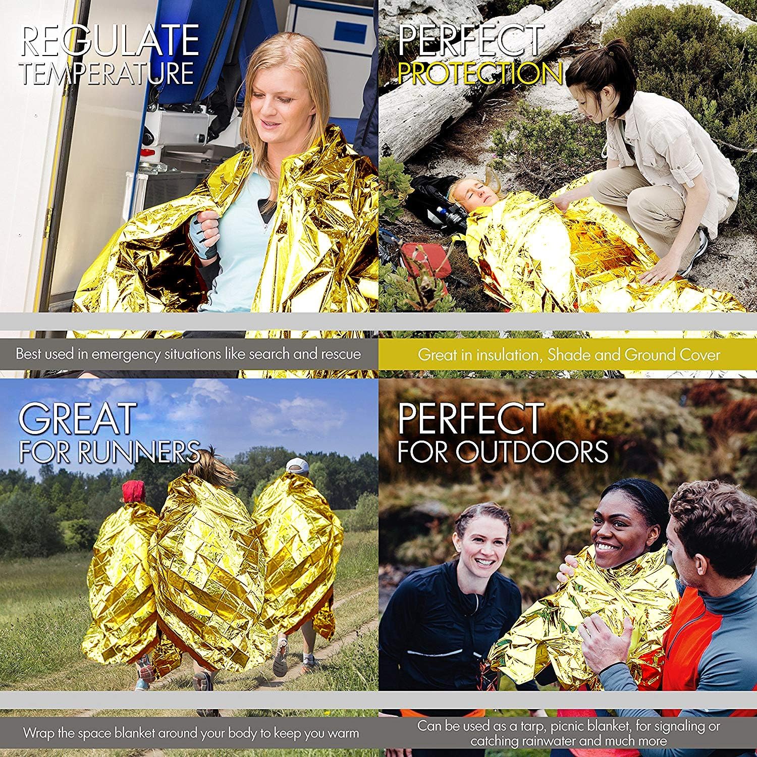 MULTI-PURPOSE USE- These silver and gold reusable blankets can be used as rain poncho, emergency tent, shelter, light duty tarp, sheets, bivy, sleeping bag, windows insulation, signal mirror, and other creative applications.
