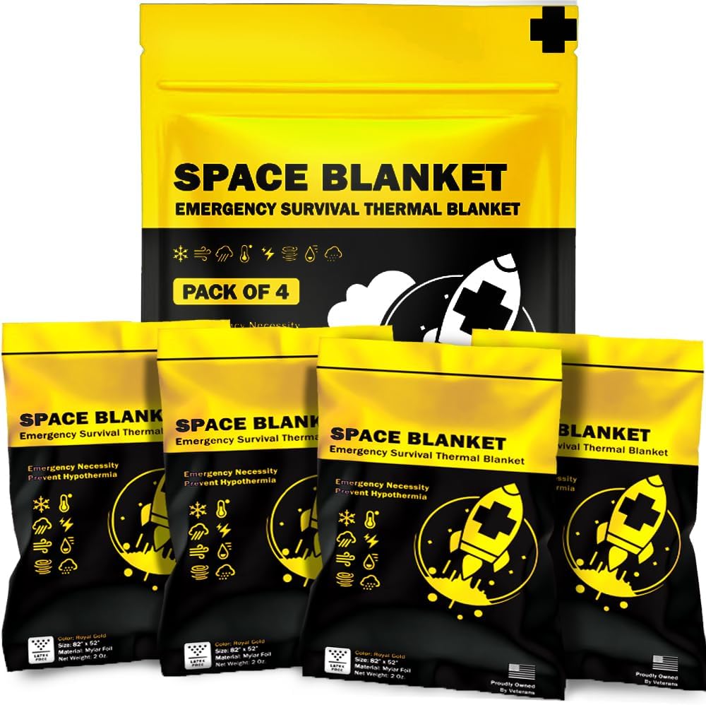 FOUR PREMIUM MYLAR EMERGENCY BLANKETS- Durable and advanced aluminized dual-sided thermal blanket, Mylar blanket, emergency blankets or space blanket, field tested by Army veterans. The sheet blankets retains up to 90% of your body heat to keep you warm in the winter nights. These heater-like thermo blankets are water and weather proof, can be use as rain ponchos.