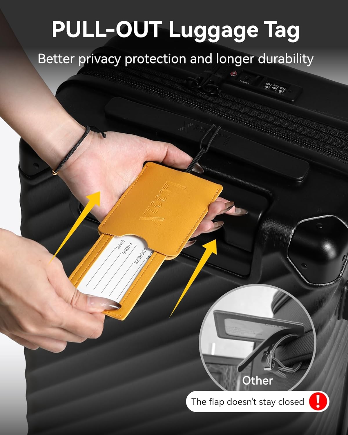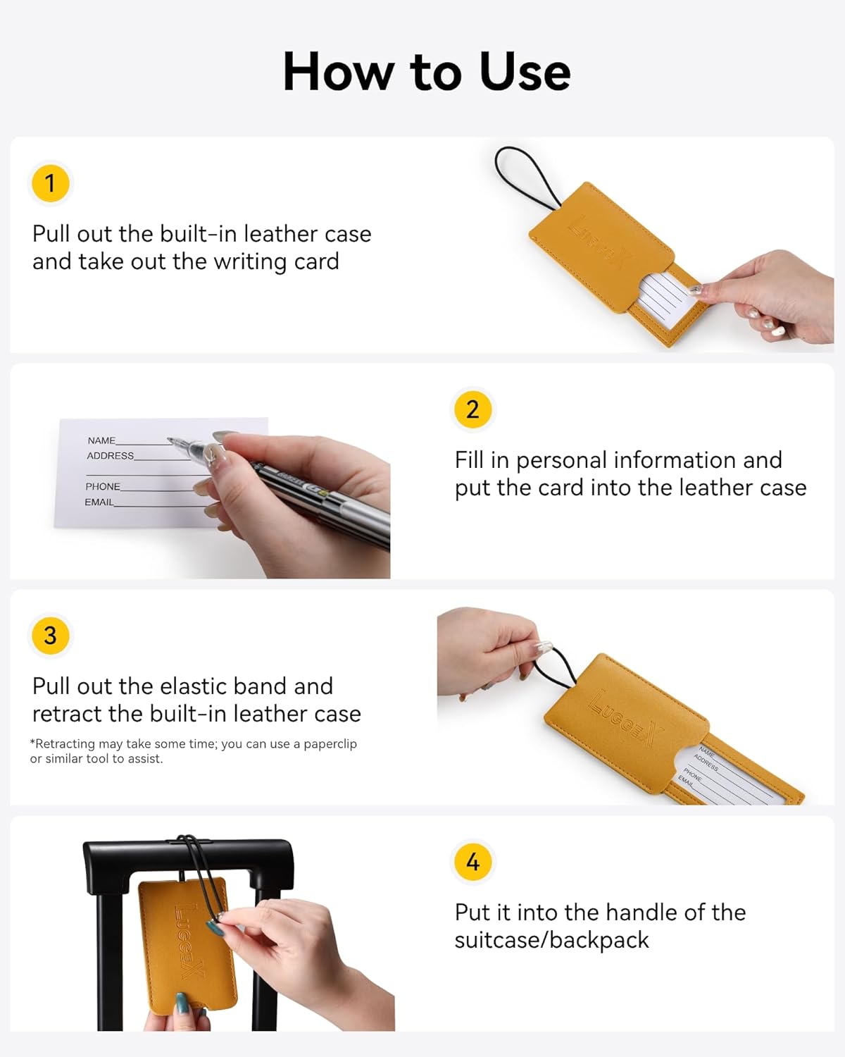 Quick Info Access: LUGGEX carry-on luggage tags feature a pull-out design and a high-elasticity band. You can effortlessly slide out your information and attach or remove the suitcase tag in seconds—no more hassle with flimsy tags or fiddling with belt buckles.
