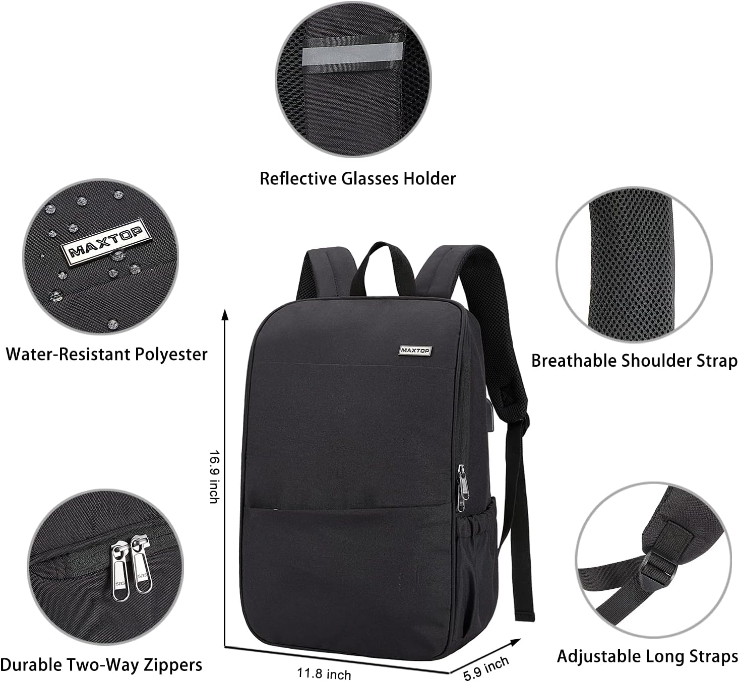 Deep Storage Backpack for School,Travel and Work — Open the main space, you can store your daily essentials, such as laptop (Up to 15.6 Inch), tablet, books, pens, power bank and charger. FRONT ZIPPER POCKET and 2 SIDE POCKETS can hold pencil box, water bottles or umbrella. Lots of pockets design make your items organized, say goodbye to dig around in bookbag.(If you have more storage needs or are taller than 5.84 feet, it is recommended to choose MAXTOP 17-inch backpack.)