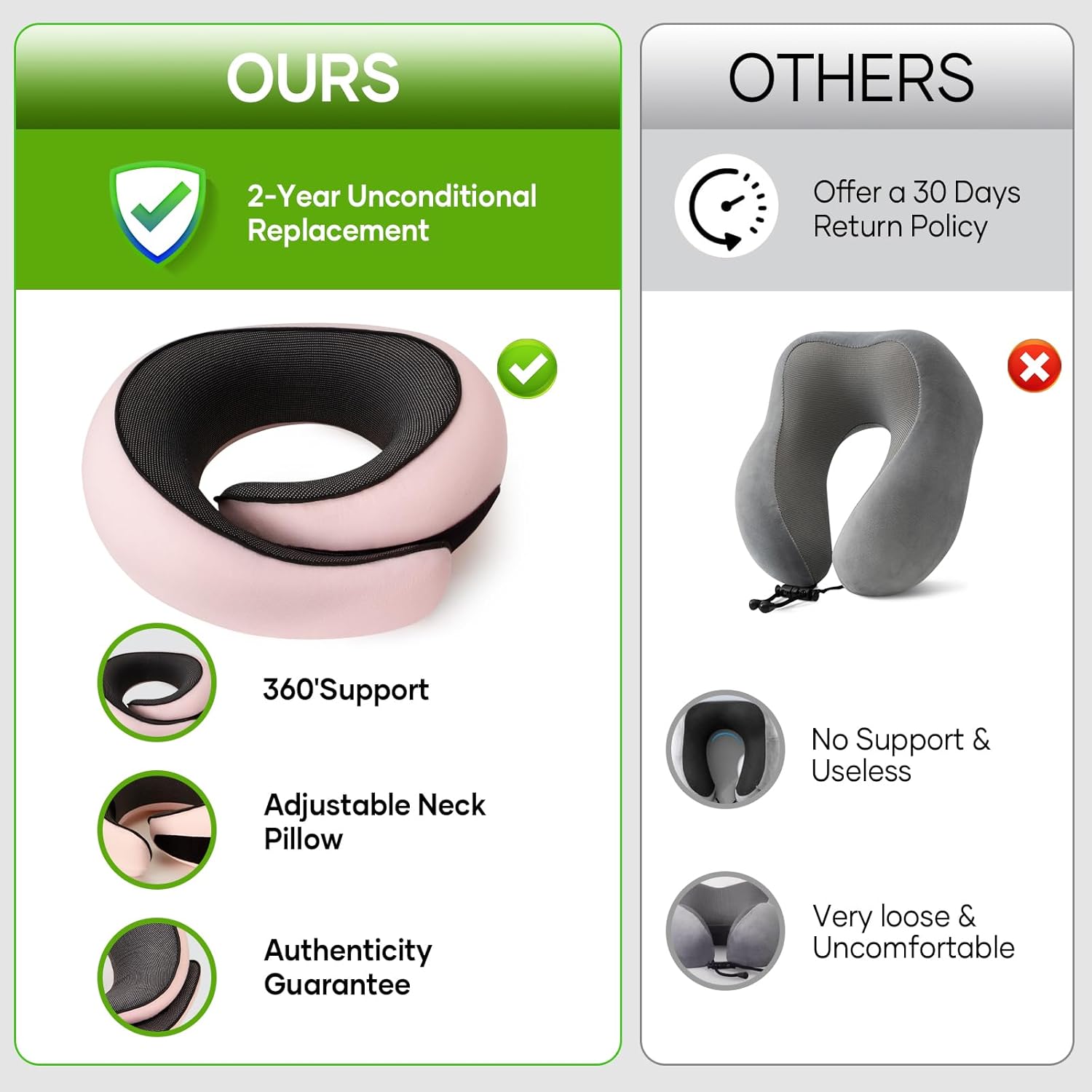 【NOTE】 Upon opening, allow the travel pillow to sit for a while to help the memory foam fully rebound. Any initial odor is normal; simply place the pillow in a well-ventilated, sunny spot to air out.For any missing parts or sizing concerns, please reach out to the seller for prompt and satisfactory assistance.