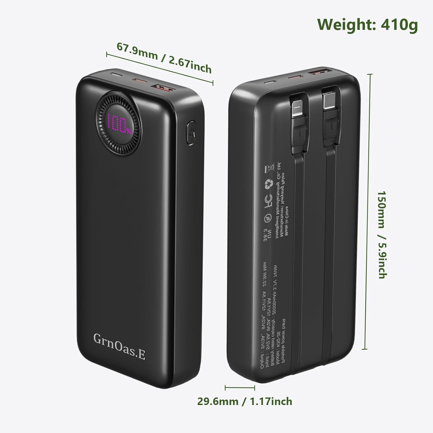 What You Get: 1 pack GrnOas.E 20000mAh Battery Charger with built in 2 cables and User Guide x 1, 3 years support for our portable battery pack.