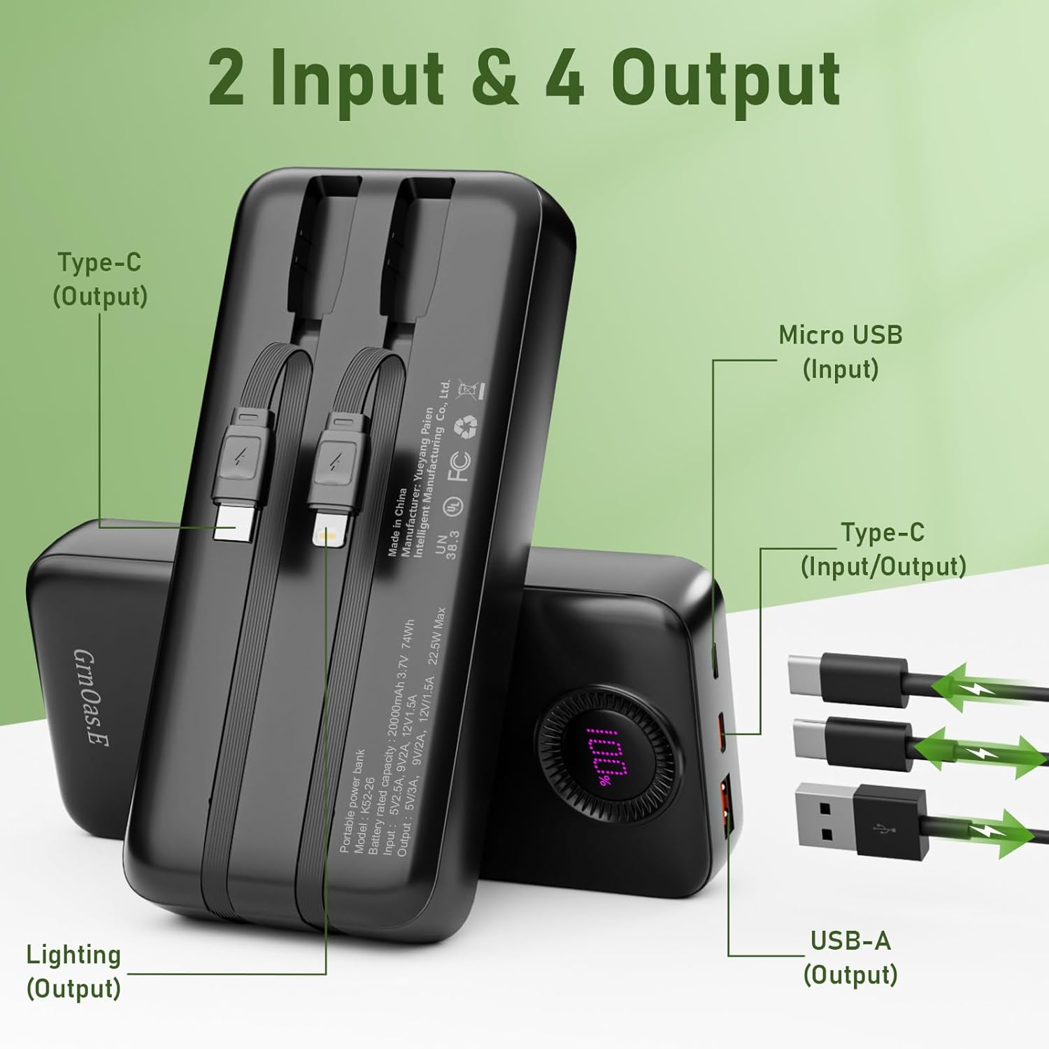 4 Outputs and 2 Inputs:GrnOas.E power bank builts in 2 output cables(type c,lighting) and another 2 outputs(usb a,usb c),Charging for 4 Devices Simultaneously.It also builts in 2 inputs (usb c input and micro input), which you can use any one of them to recharge the external battery pack conveniently.