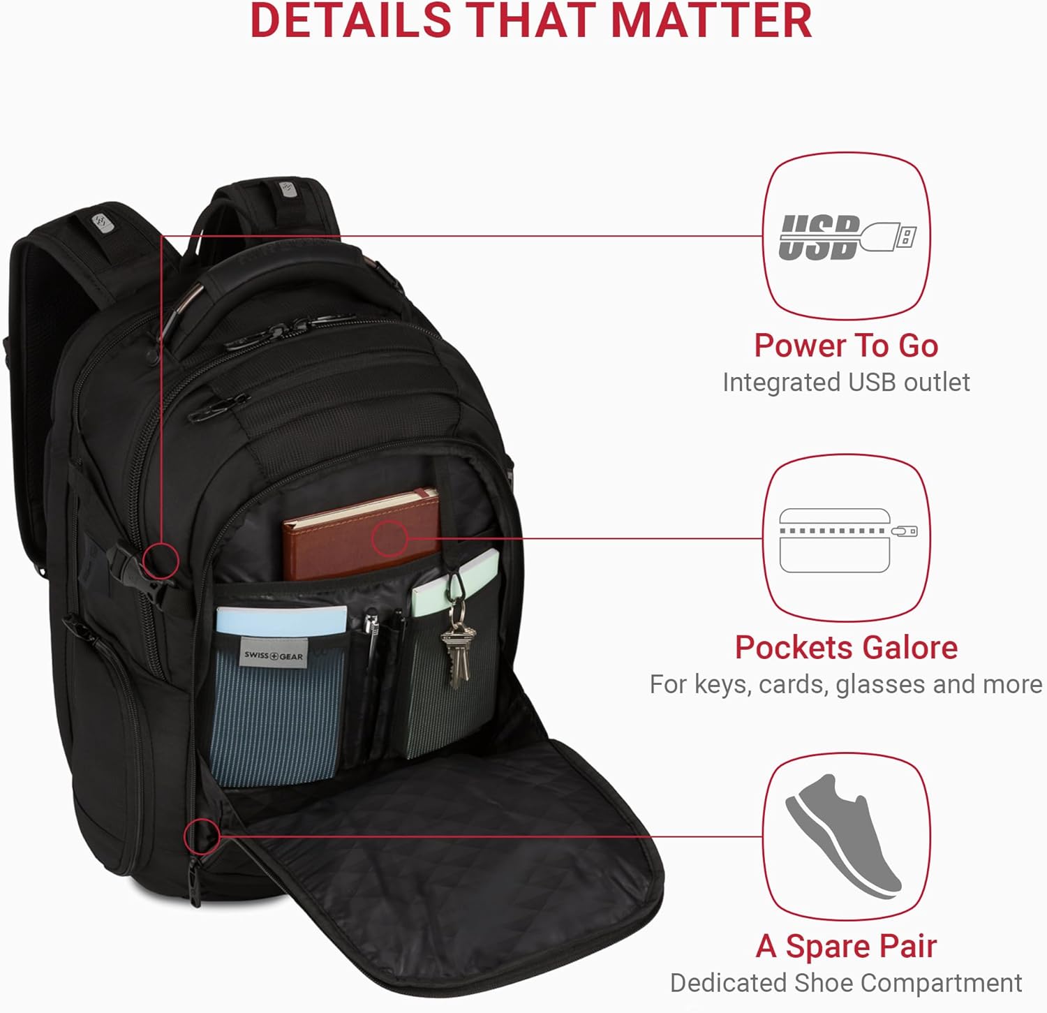 16-Inch Laptop Backpack: Travel-ready design with TSA-friendly SmartScan tech compartment for a 16″ laptop and 11″ tablet, a built-in USB outlet for charging, and smart organizers to keep pens, tech gear, and even a spare pair of shoes within reach.