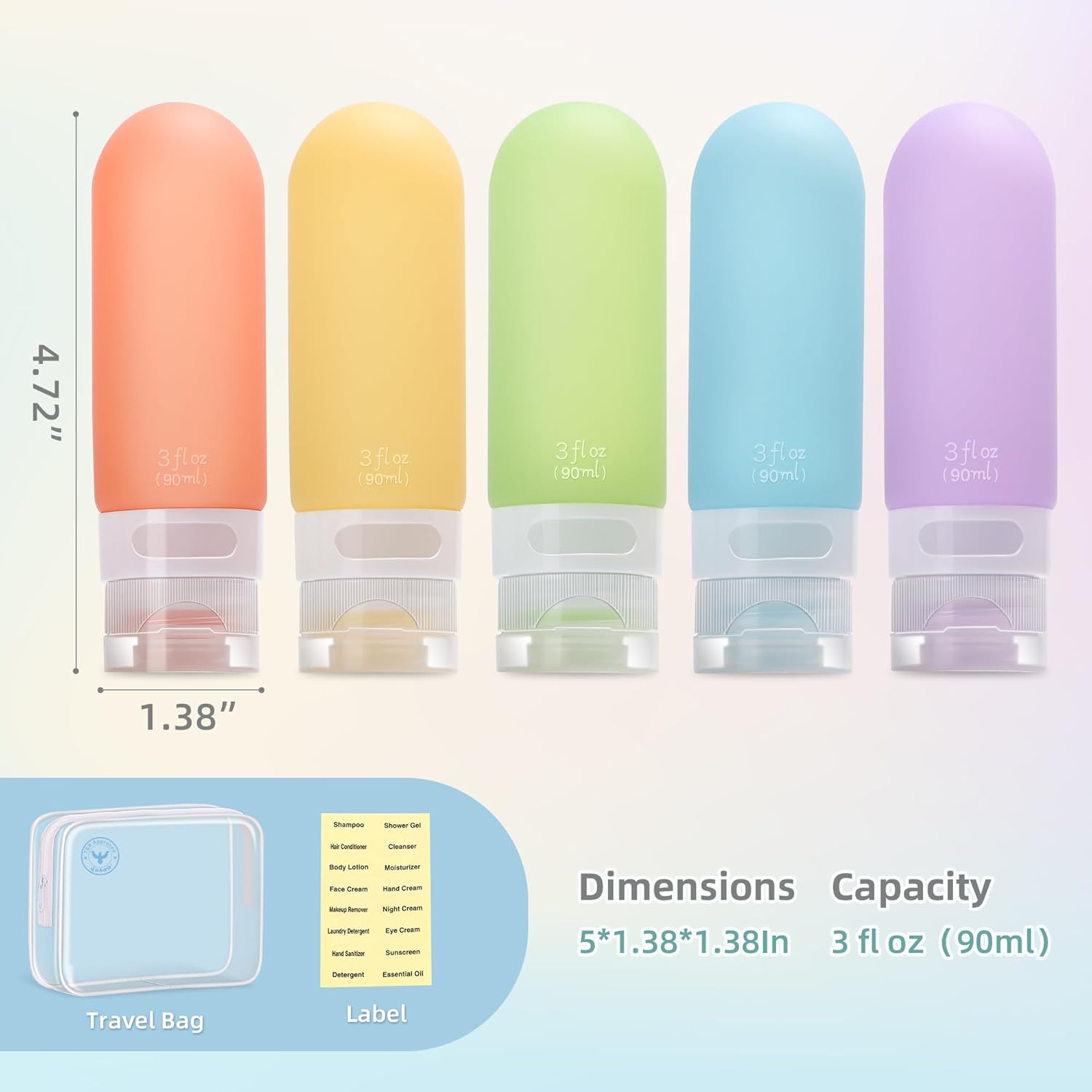 5 x 3oz Silicone Travel Bottles+1 x Sticker Label+1 x A Zipper Clear Travel Toiletry Bag.