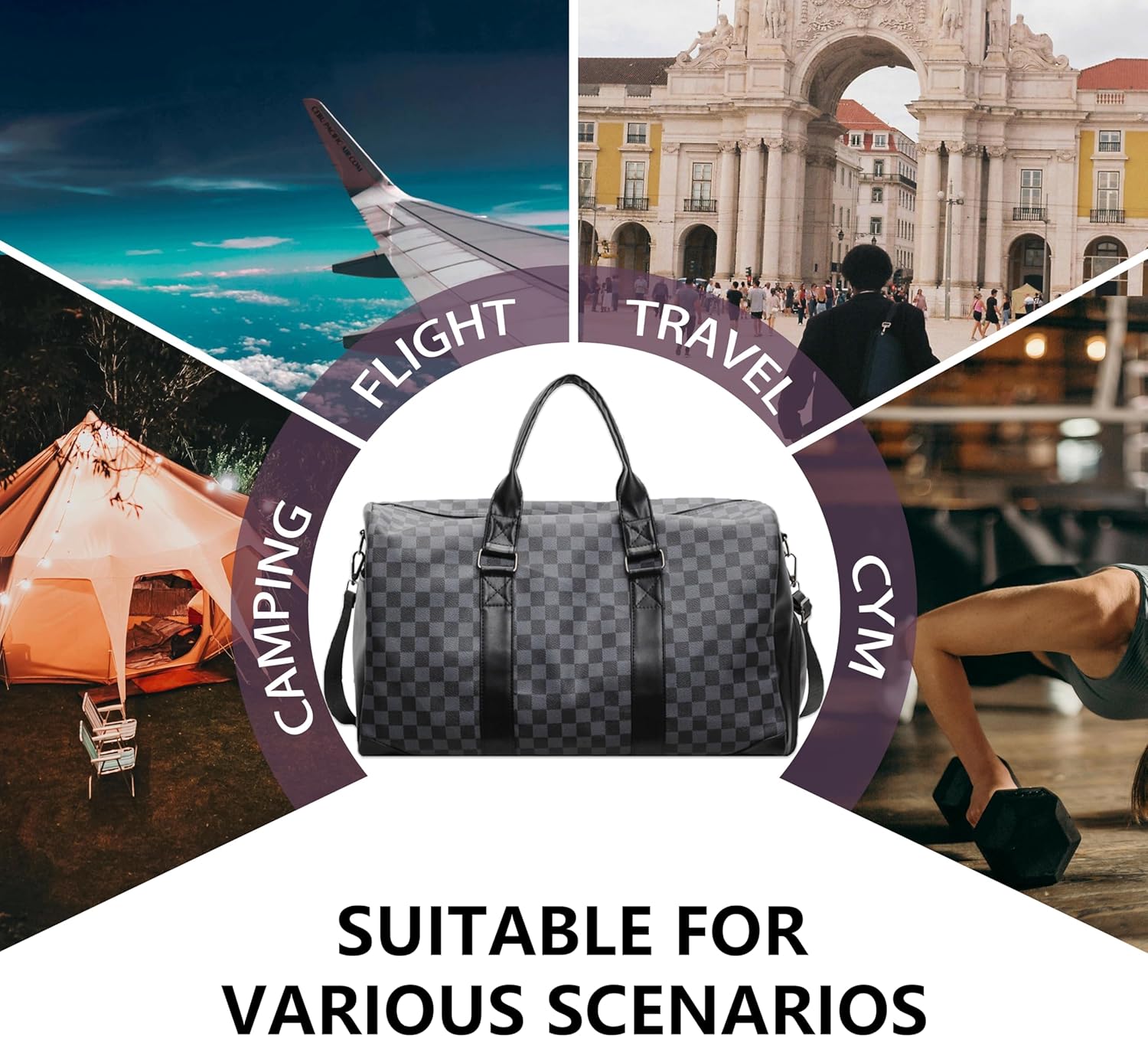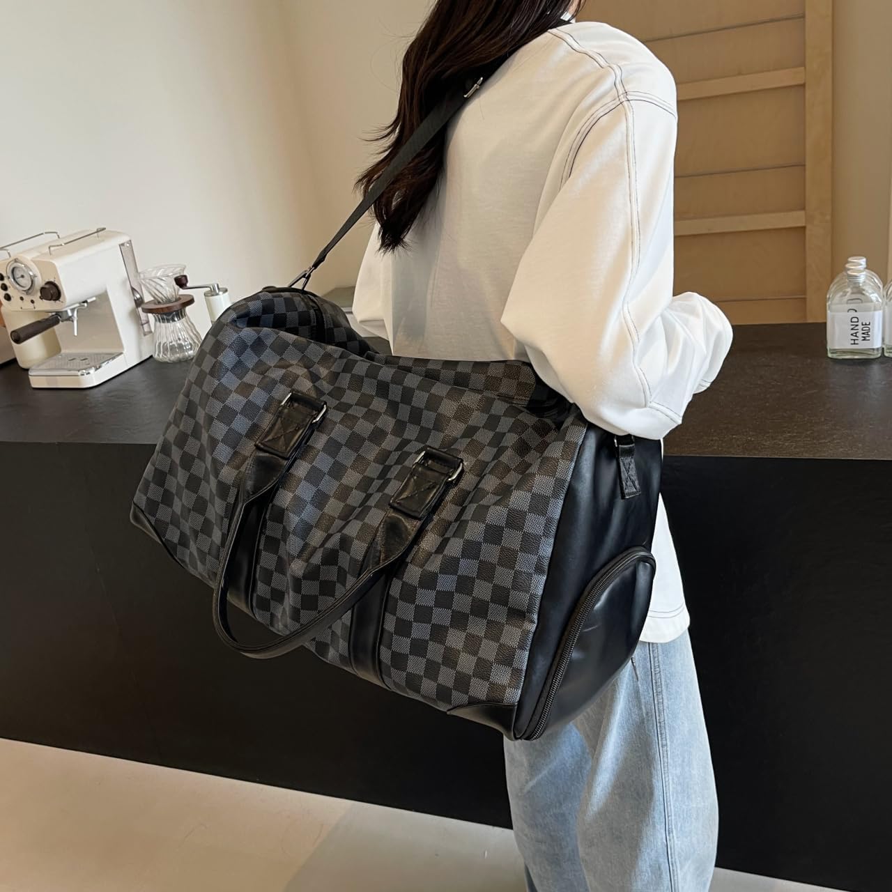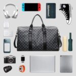 Spacious 40L duffel bag perfect for weekend trips, featuring a classic checkered pattern design in black and grey tones