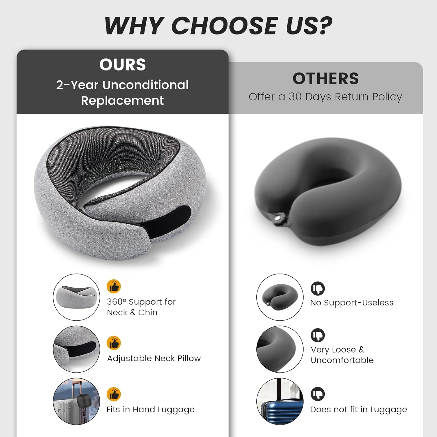 Ergonomic 360-Degree Support: Our travel neck pillow features ergonomic design and adjustable Velcro closure, ensuring your head and chin stay in place, offering full neck support even on long flights.