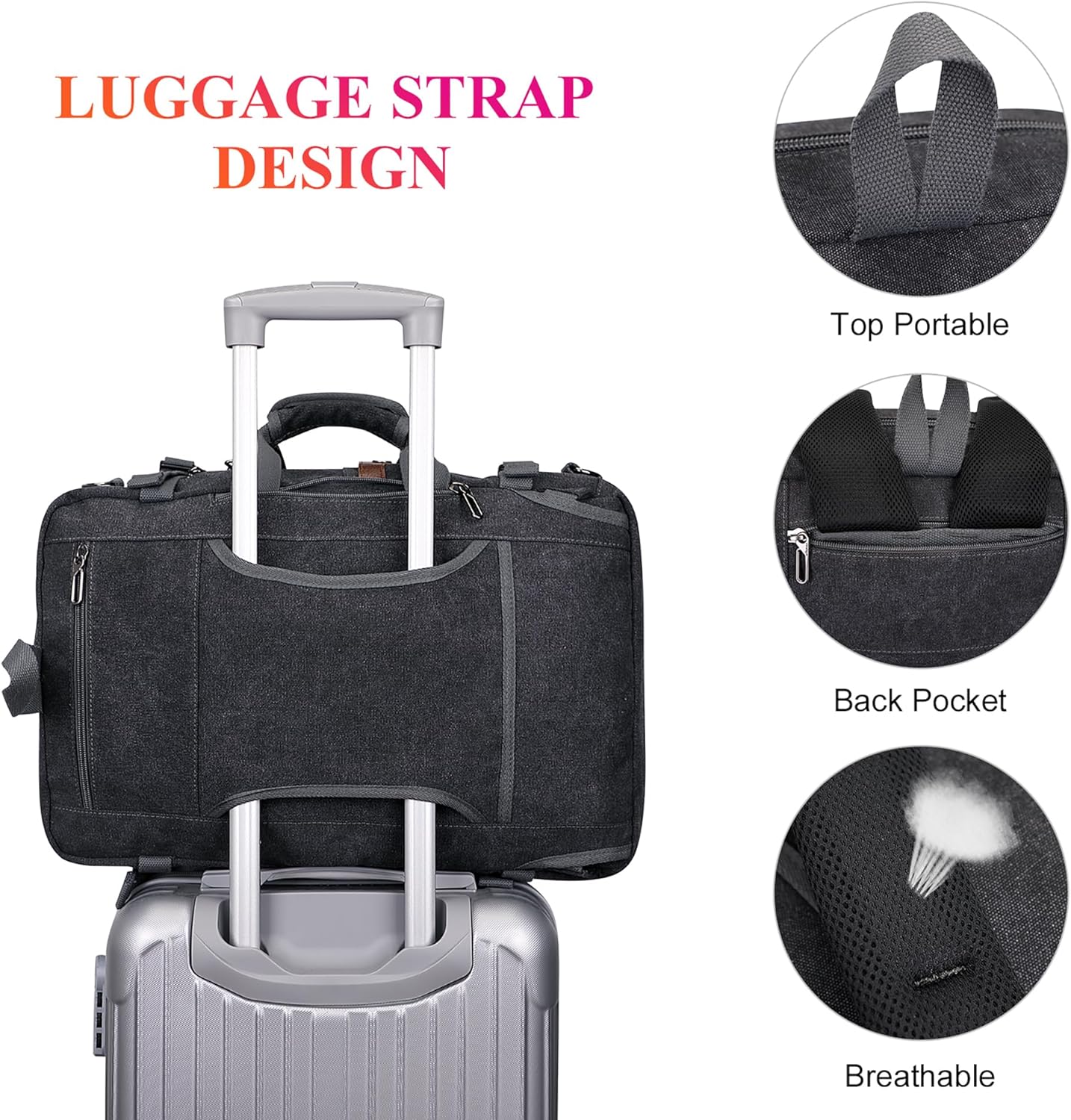 Multifunctional Backpack: You can easily convert this backpack into a Backpack ,Duffel Bag, Crossbody Bag, Tote Bag; This canvas rucksack come with a woven removable and adjustalbe duffel strap. The backpack straps can be hidden in the back strap pocket when you carry this bag as duffel bag,or crossbody bag or tote bag,or carry on backpack.
